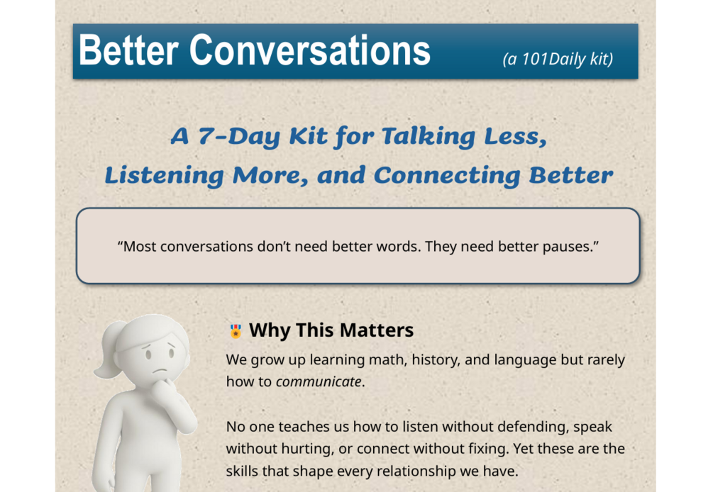 ⭐ Better Conversations 101 — A simple 7-day guide that helps you listen better, speak more clearly, and connect more deeply. Better Conversations 101 gives you small, practical shifts that make every relationship feel easier, warmer, and more real — without pressure or overwhelm.